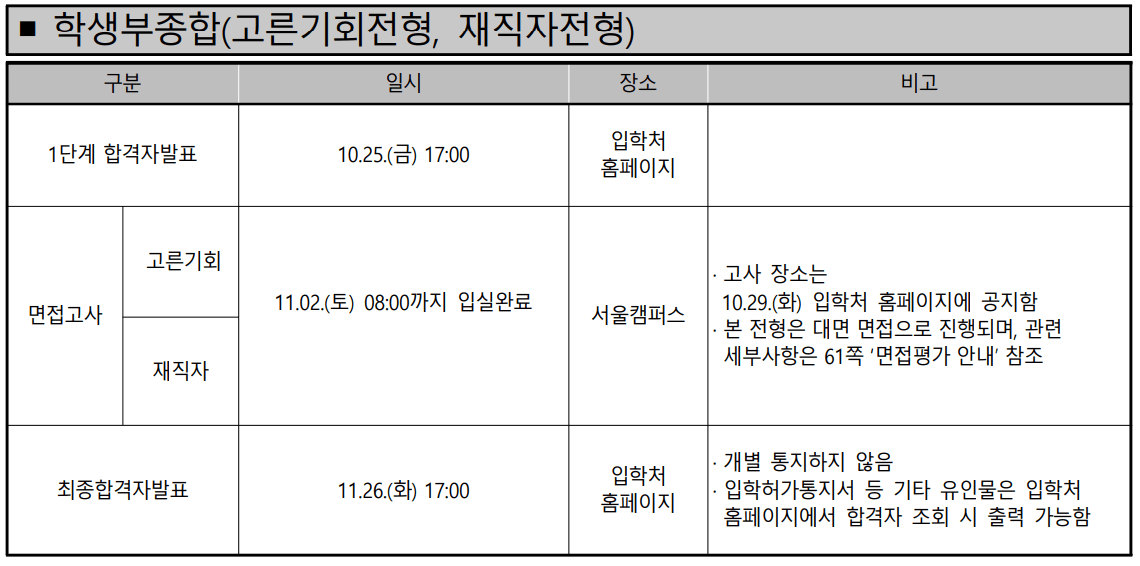 | 원서접수 | 일시 : 2024.9.9.(월) 오전 10시 ~ 9.11.(수) 오후 5시까지 장소 :입학처 홈페이지( oku.korea.ac.kr ) * 인터넷 원서접수 대행기관 유웨이어플라이( https://www.uwayapply.com ) |