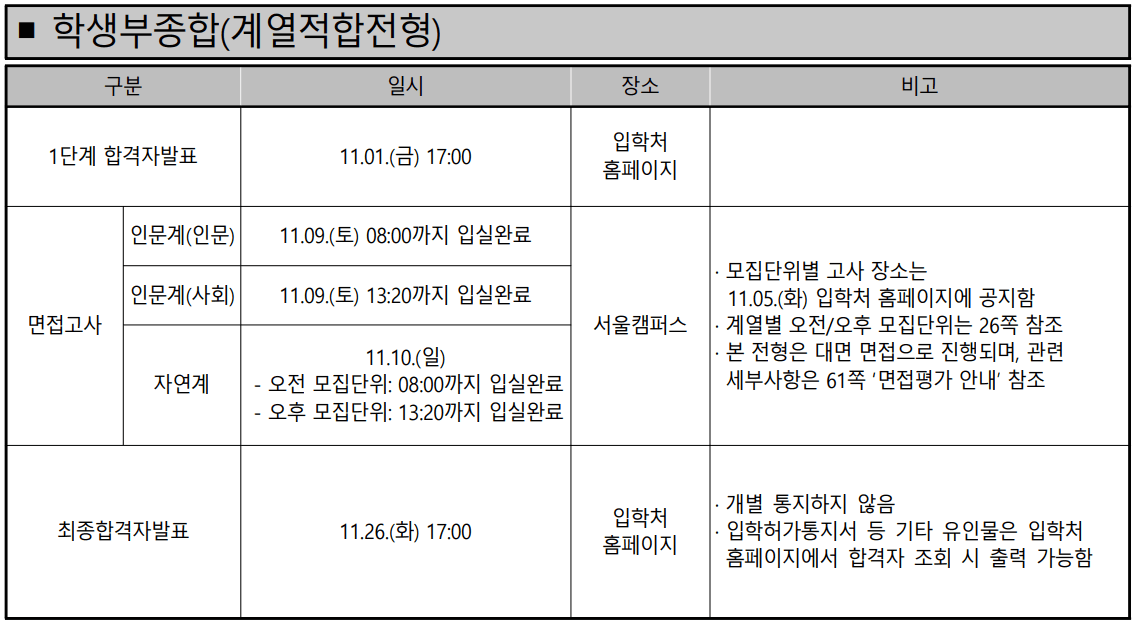 | 서류제출 | [온라인] 1. 일시 : 9월 9일(월) 오전 10시 ~ 9월 11일(수) 오후 7시까지 ※ 입력기간 이후에는 입력(수정) 일절 불가 2. 장소 : 입학처 홈페이지 ( oku.korea.ac.kr ) 3. 비고 : 해당자에 한함, 해당 전형의 서류제출 방법 참조 [등기우편] 1. 국내 : 9월 12일(목) 우체국 접수(등기우편)까지 유효 2. 국외 : 9월 13일(금) 입학처 도착 분까지 유효 3. 등기우편 주소 : (02841) 서울특별시 성북구 안암로 145 고려대학교 라이시움 입학처 OO전형 담당자 4. 비고 : 해당자에 한함, 우편접수(등기우편)만 가능함 |