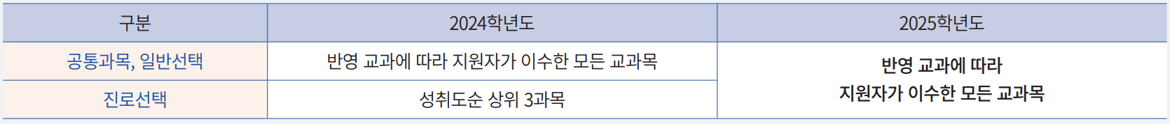 | 성취도별 등급 부여 | A: 1등급, B: 2등급, C: 3등급 | A: 1등급, B: 2등급, C: 4등급 |