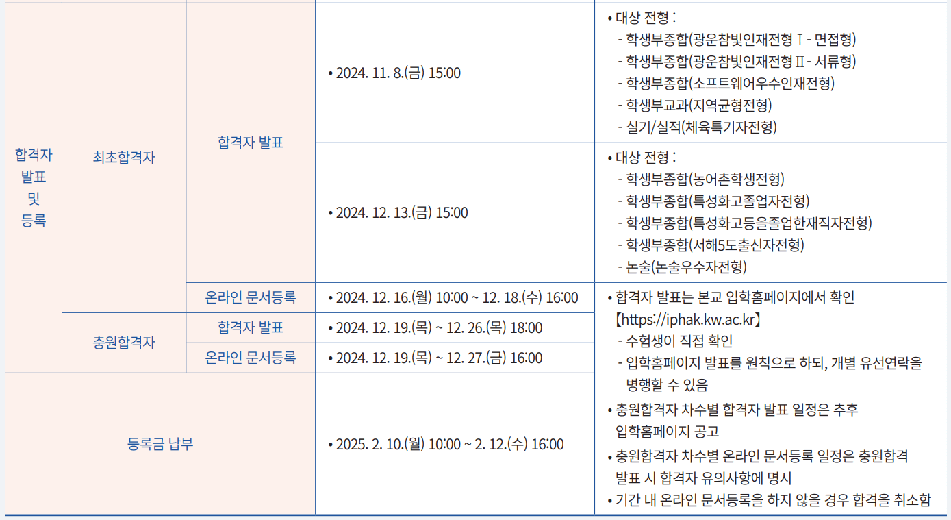 2025학년도 광운대 수시모집 최초합격자 발표일 및 충원(추가) 합격자 발표일에 대한 안내를 해드리도록 하겠습니다. 아래 일정을 참고하셔서 등록에 차질이 없으시기 바랍니다.