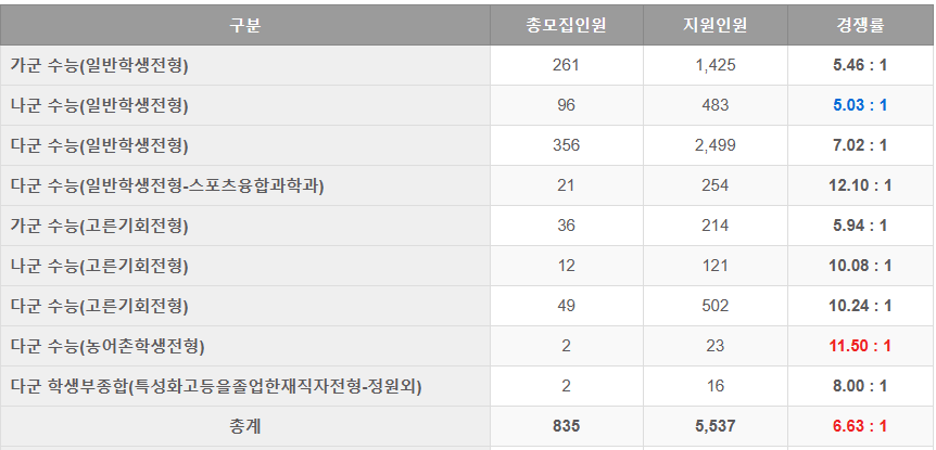 2024학년도 광운대 정시모집 경쟁률 및 입시결과를 알아보도록 하겠습니다. 총 모집인원 835명, 지원인원 5,537명으로 6.63대 1의 경쟁률을 보여주었습니다. 전형별 경쟁률 현황을 살펴보면, 아래 표와 같습니다. 세부 모집단위(학과)의 경쟁률은 아래 이미지를 클릭해 보시면 자세히 살펴보실 수 있습니다.