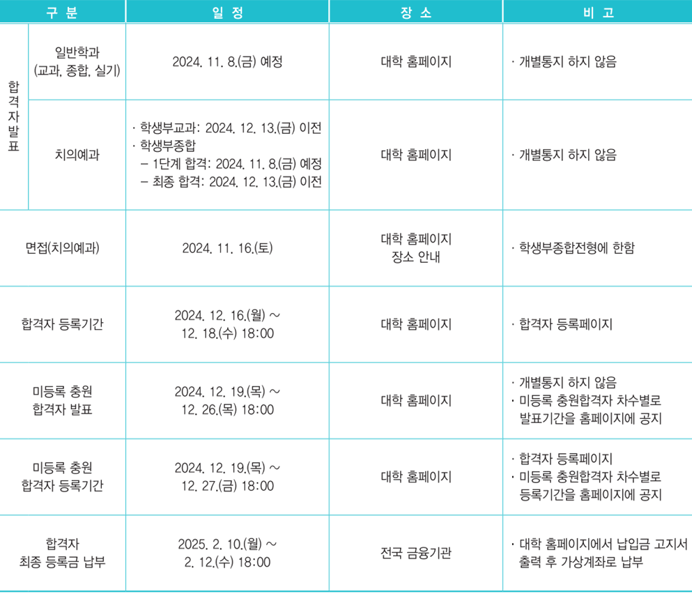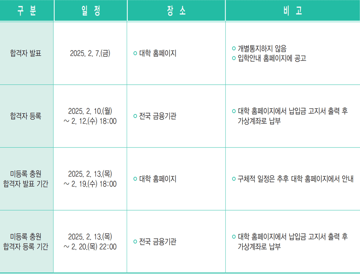 | 합격자 발표 | 2025. 2. 7.(금) | * 대학 홈페이지 | * 개별통지하지 않음 * 입학안내 홈페이지에 공고 |