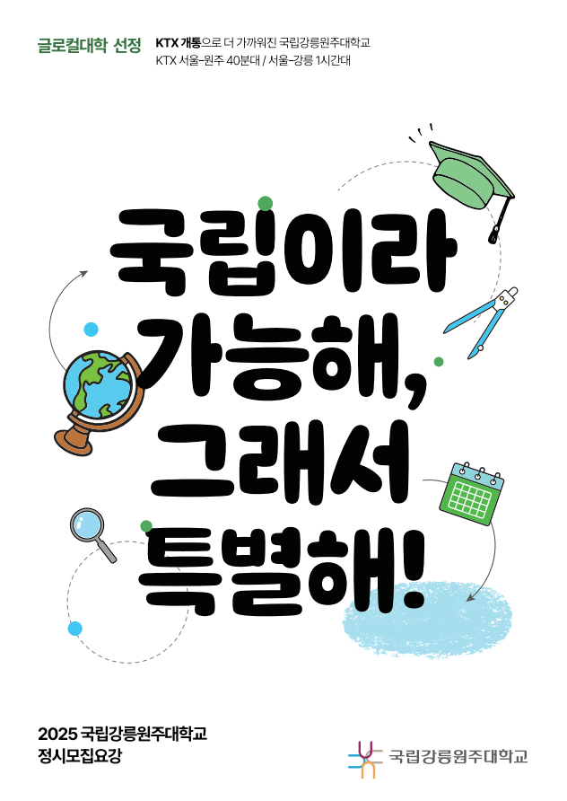 1946년 설립되어 개교 78년의 역사를 자랑하는 국립강릉원주대학교는 자유, 진리, 창조를 교육이념으로 삼고 강릉대학교와 원주대학을 통합한 이후 지역발전을 견인하는 중부권 국가중심대학으로서의 발전을 거듭해 오고 있습니다. 지역발전의 브레인이자 엔진 역할을 수행하여 지역 내 최고의 명문대학으로 인정받는 핵심대학 캠퍼스(Flagship University Campus)로서의 면모를 갖추는 발걸음을 내딛고 있는 국립강릉원주대의 2025학년도 정시모집 합격자 발표 및 충원합격자 1차~7차 발표 조회, 정시모집 실시간 경쟁률, 수시모집 합격자 발표 및 충원(추가) 합격자 발표, 정시모집 원서접수일 및 서류제출, 정시모집요강, 정시모집 주요 변경사항, 모집군, 2024학년도 정시모집 경쟁률 및 입시결과, 수능성적 산출, 학과소개, FAQ 및 Q&A 등에 대해서 알아보도록 하겠습니다.
