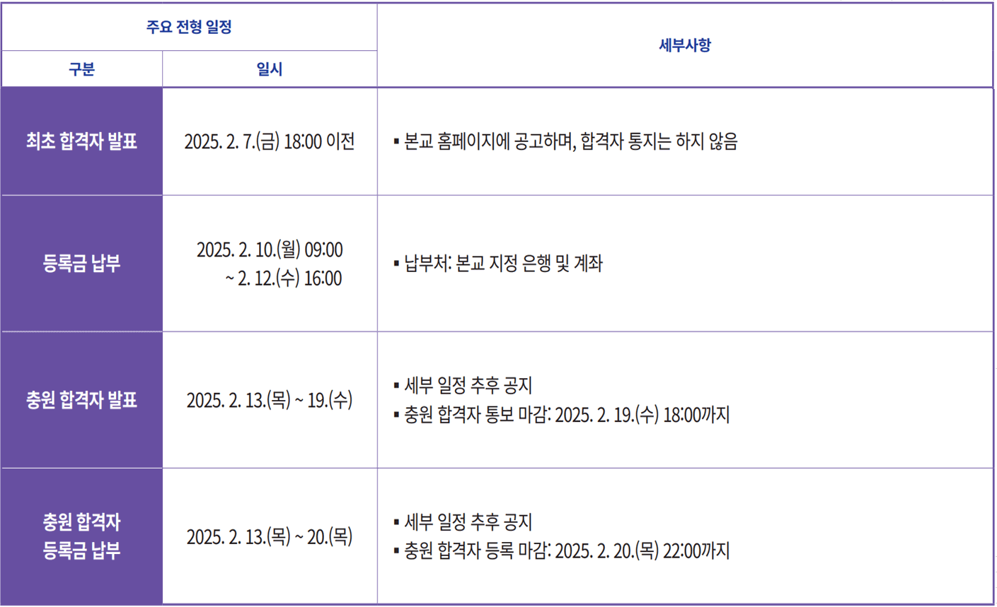 | 충원 합격자 발표 | 2024.12.19.(목) ~ 12.26.(목) 18:00까지 |