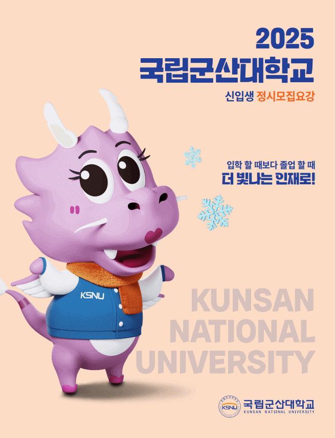 2025학년도 국립군산대 정시모집 지원을 희망하는 수험생분들을 위해 학과에 대한 소개를 안내해 드리겠습니다. 대학소개, 교수진, 학과소개, 교과과정, 학사안내, 학과소식, 취업현황 및 정보, 장학제도, 비교과활동, 입학안내 등 각 학과의 특·장점들의 내용이 수록되어 있습니다. 천천히 읽어보시고 지원 시 도움이 되시기 바랍니다.