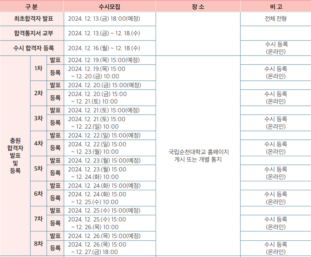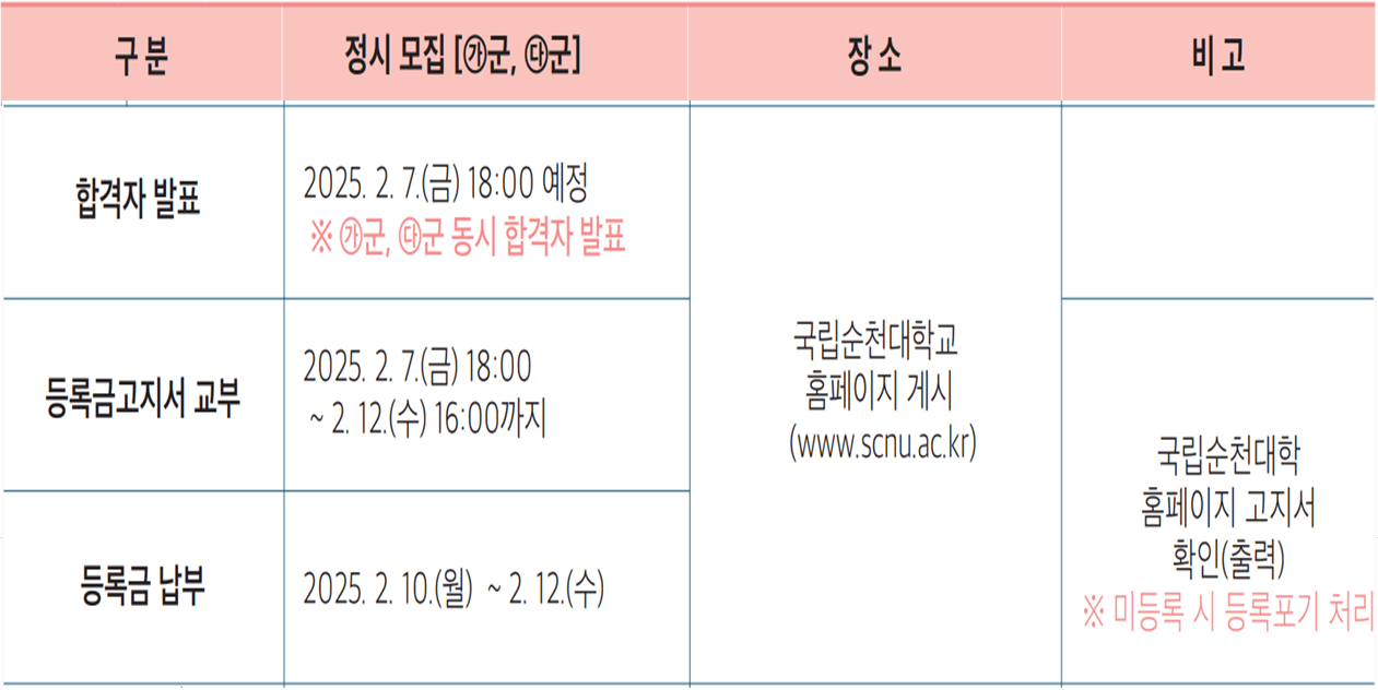 2025학년도 국립순천대 수시모집 합격자 발표일 및 충원(추가) 합격자 발표일 등을 안내해 드리도록 하겠습니다. 아래 일정을 참고하셔서 입학 등록에 차질이 없으시기 바랍니다.