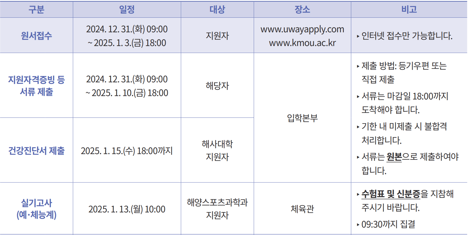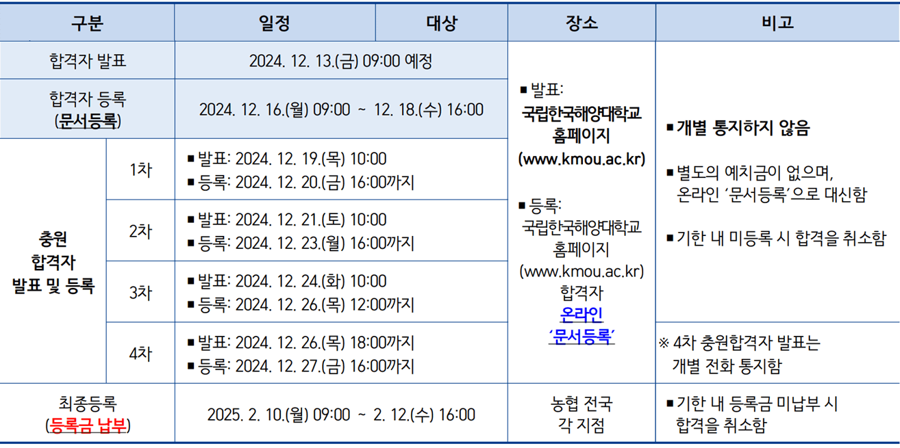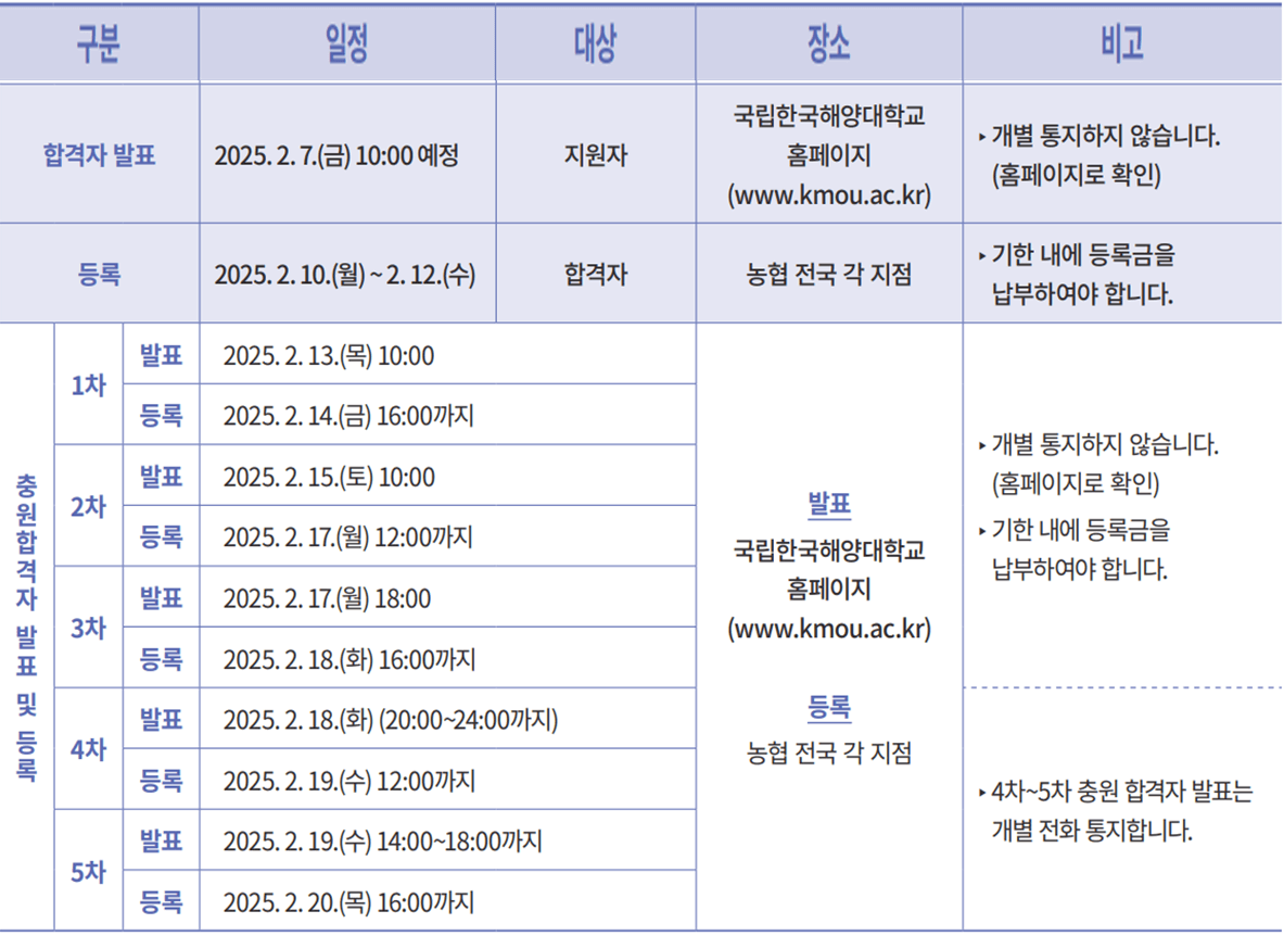 2025학년도 국립한국해양대 수시모집 합격자 발표일 및 충원(추가) 합격자 발표일 등을 안내해 드리도록 하겠습니다. 아래 일정을 참고하셔서 입학 등록에 차질이 없으시기 바랍니다.