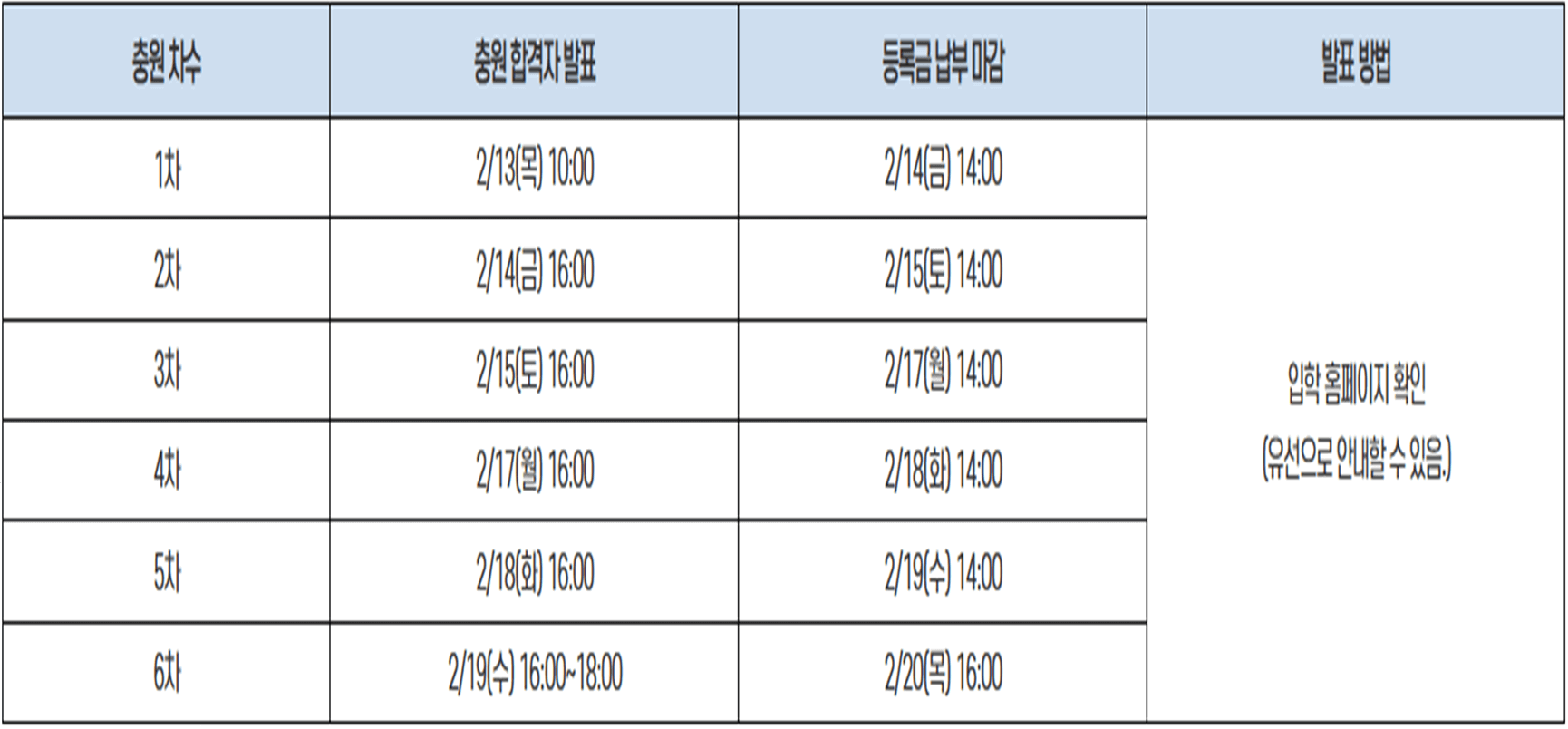 - 충원 합격 발표는 홈페이지로 공지하나 진행 상황에 따라 지원자 휴대폰 번호로 충원 합격 사실을 통보할 수 있으며, 연속 3회까지 전화 연결이 되지 않는 경우 등록 포기로 처리됨.