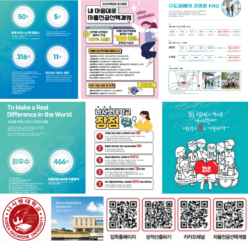 2025학년도 나사렛대 정시모집 지원을 희망하는 수험생분들을 위해 학과에 대한 소개를 안내해 드리겠습니다. 학부소개, 교육목표, 졸업 후 진로, 취득 자격증, 트랙소개, 교수소개, 교과과정, 졸업요건, 학생회, 동아리, 취업공지, 장학공지 등 각 학과의 특·장점들의 내용이 수록되어 있습니다. 천천히 읽어보시고 지원 시 도움이 되시기 바랍니다.