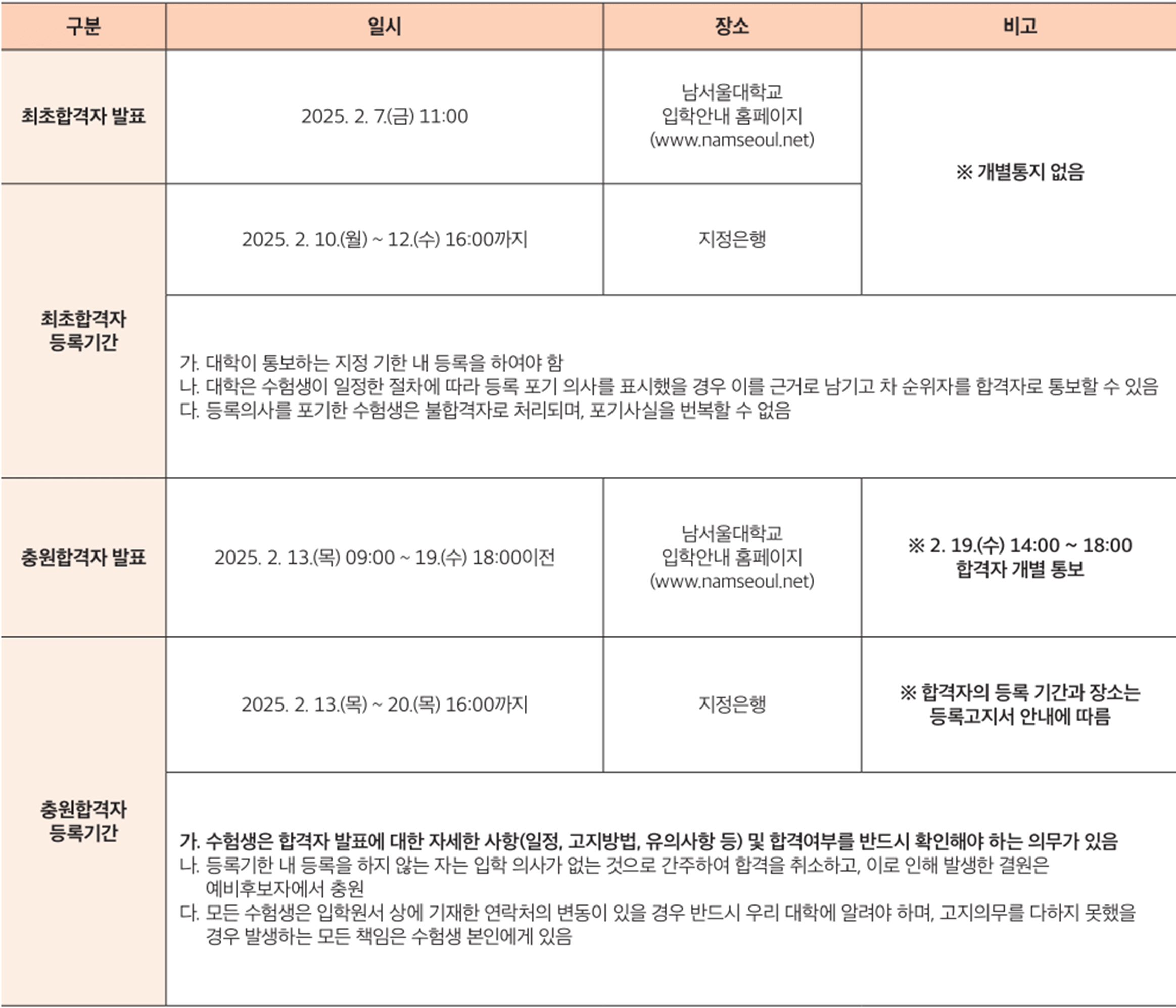 2025학년도 남서울대 정시모집 합격자 발표일 및 충원합격자 발표일에 대해사 안내해 드리도록 하겠습니다.