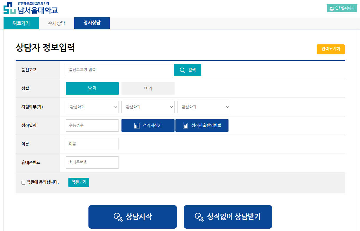 남서울대학 정시모집 전에 정시상담을 받아보시면 어느 정도 합격여부를 가늠해 보실 수 있습니다. 지원학부(과), 성적입력 등을 입력하고 상담시작 혹은 성적 없이 상담받기 버튼을 클릭하시면 상담 결과를 확인하실 수 있습니다. 잘 활용하셔서 합격의 영광을 누리시기 바랍니다.
