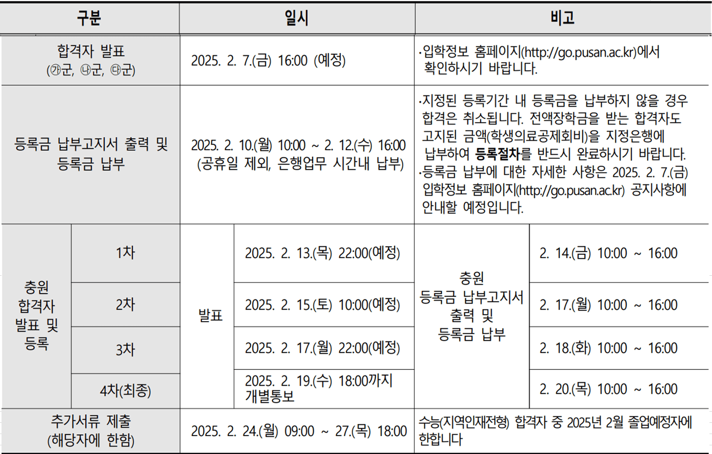 2025.2.7.(금) 16:00 (예정) | *입학정보 홈페이지 ( http://go.pusan.ac.kr ) 에서 확인하시기 바랍니다. |