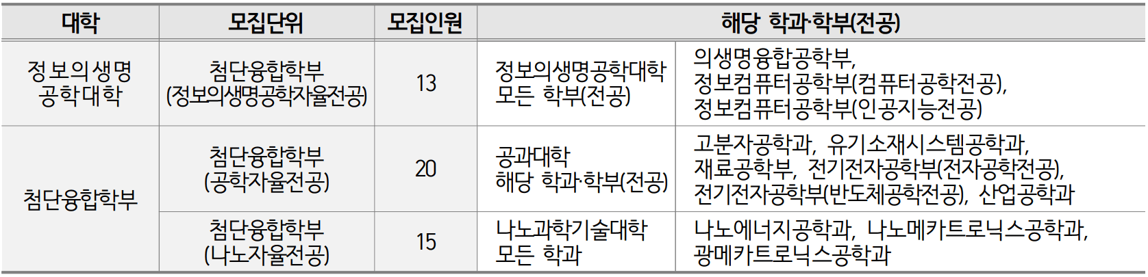 ※ 모집단위(학과)에서 2개 학기 이수 후 해당 학과·학부(전공)를 희망학과 입학정원의 150% 이상 범위 내에서 선택할 수 있습니다.