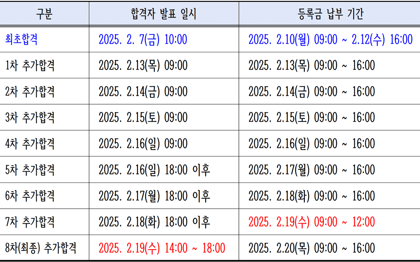 ◈ 정시모집 합격자 발표일 및 충원합격자 발표일 안내