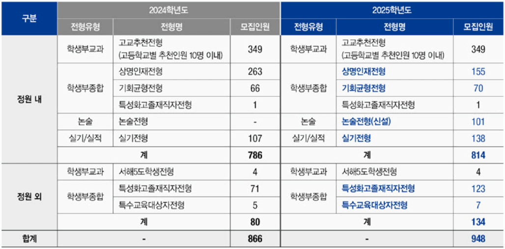 | 모집단위(학과) 확대 | * 무용예술전공, 생활예술전공, 음악학부 | * 스포츠건강관리전공, 조형예술전공 무용예술전공, 생활예술전공, 음악학부 ※ 2025학년도부터 수시모집에서 통합 시행 |