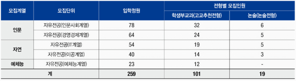 | 전형방법 | 미시행 | * [일괄합산] 학생부교과 10% + 논술고사 90% * 약술형 논술[인문/자연(애니메이션전공 포함)] * 수능 최저학력기준 없음 |