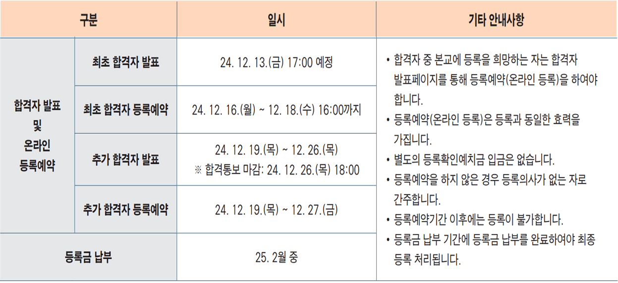 | 온라인 원서접수 | 24. 12. 31.(화) 10:00 ~ 25. 1. 3.(금) 18:00 (기간 내 24시간 접수 가능) |