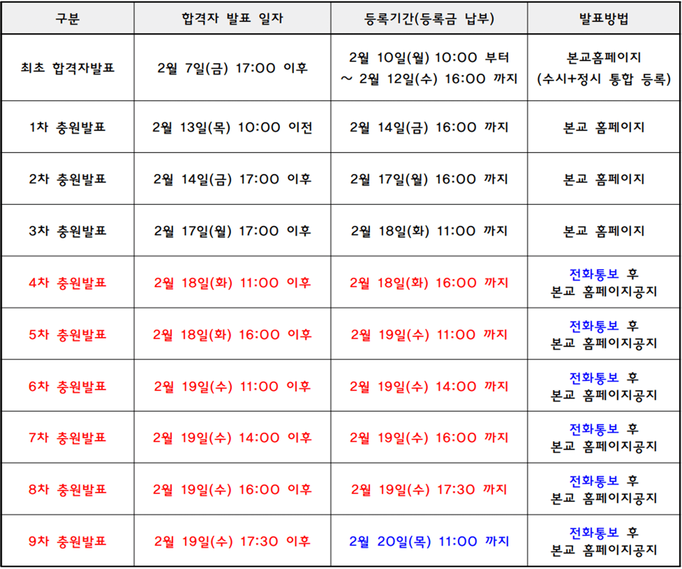 정시모집 합격자 발표 및 충원합격자 발표