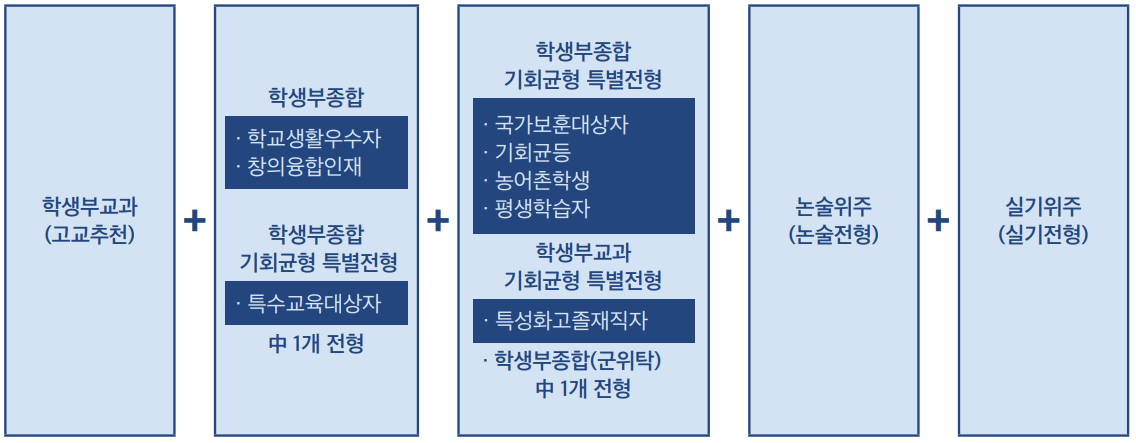 - 졸업자 및 졸업예정자 전원 3-1학기 성적까지 반영(단, 특성화고졸재직자전형은 2-2학기 성적까지 반영)