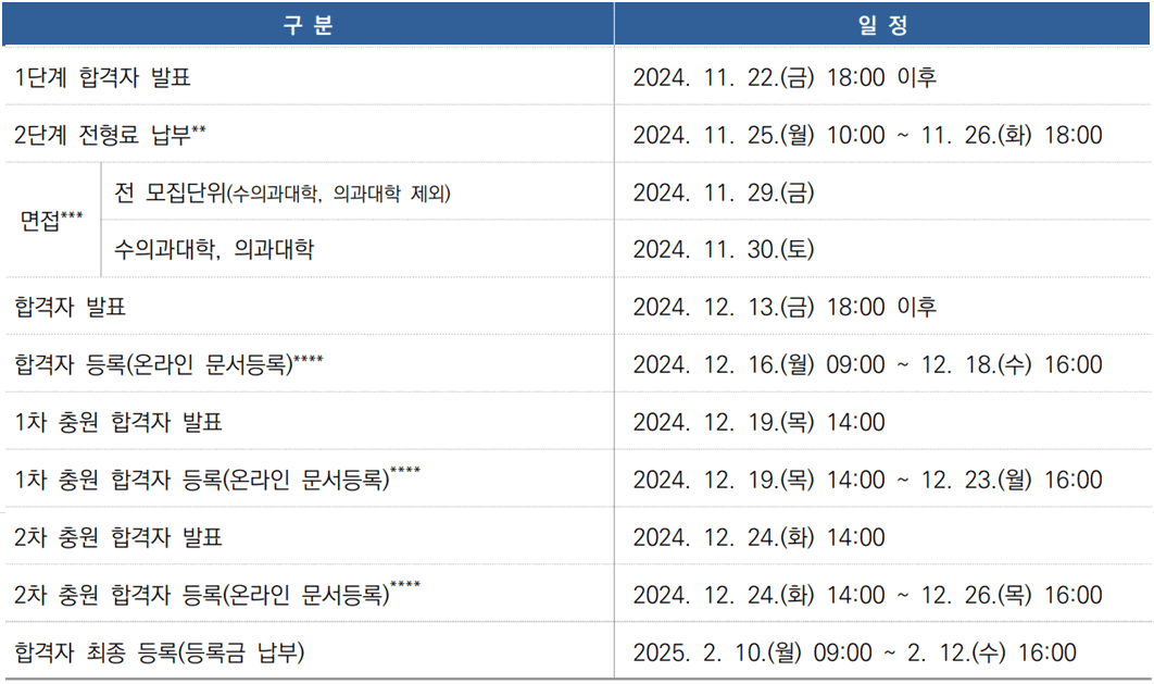 2025학년도 서울대 수시모집 합격자 발표일 및 충원(추가) 합격자 발표일 등을 안내해 드리도록 하겠습니다. 아래 일정을 참고하셔서 입학 등록에 차질이 없으시기 바랍니다.