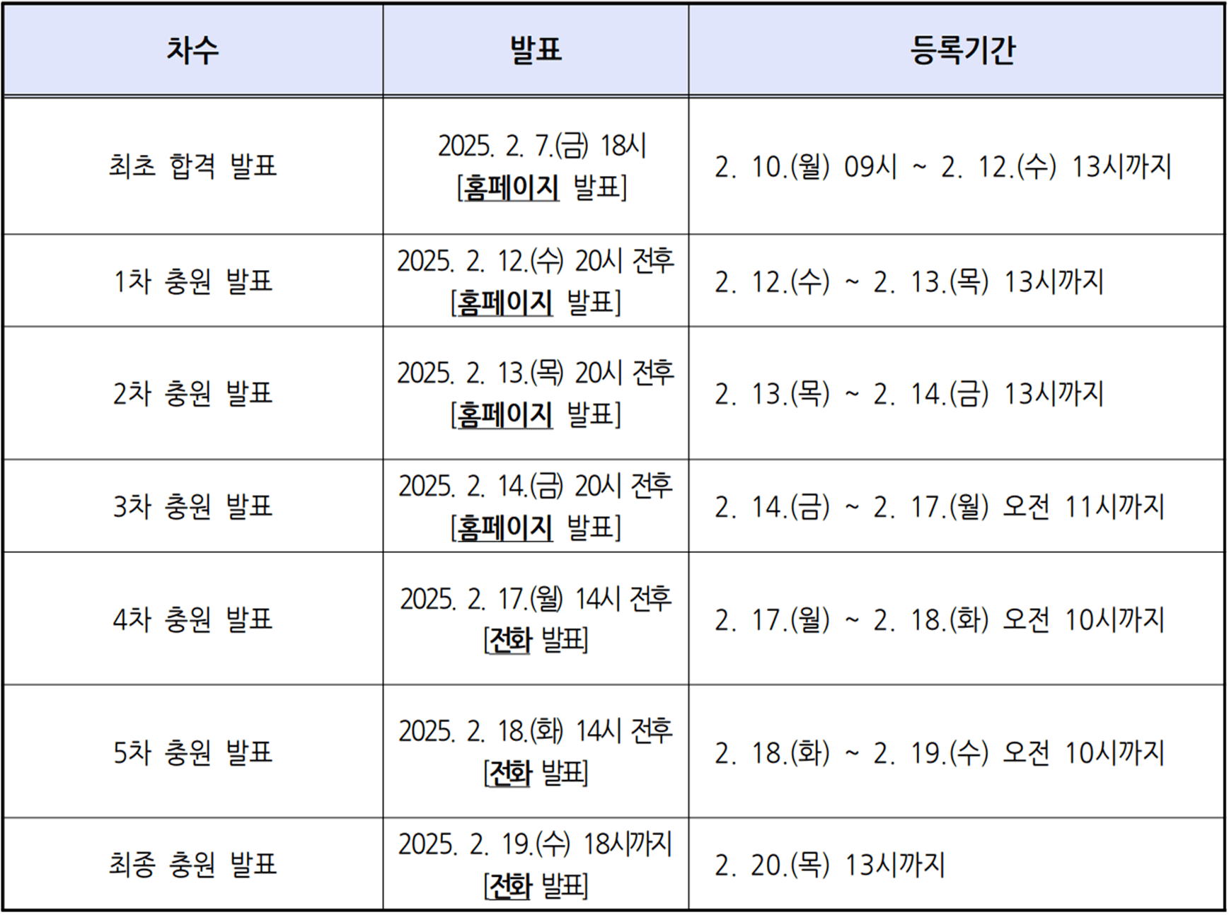 - 5차 충원 : 2025. 2. 18.(화) 14시 전후 [전화 발표]