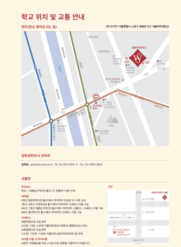 · 주소: (01797) 서울특별시 노원구 화랑로 621 서울여자대학교 입학팀 입시담당자 앞