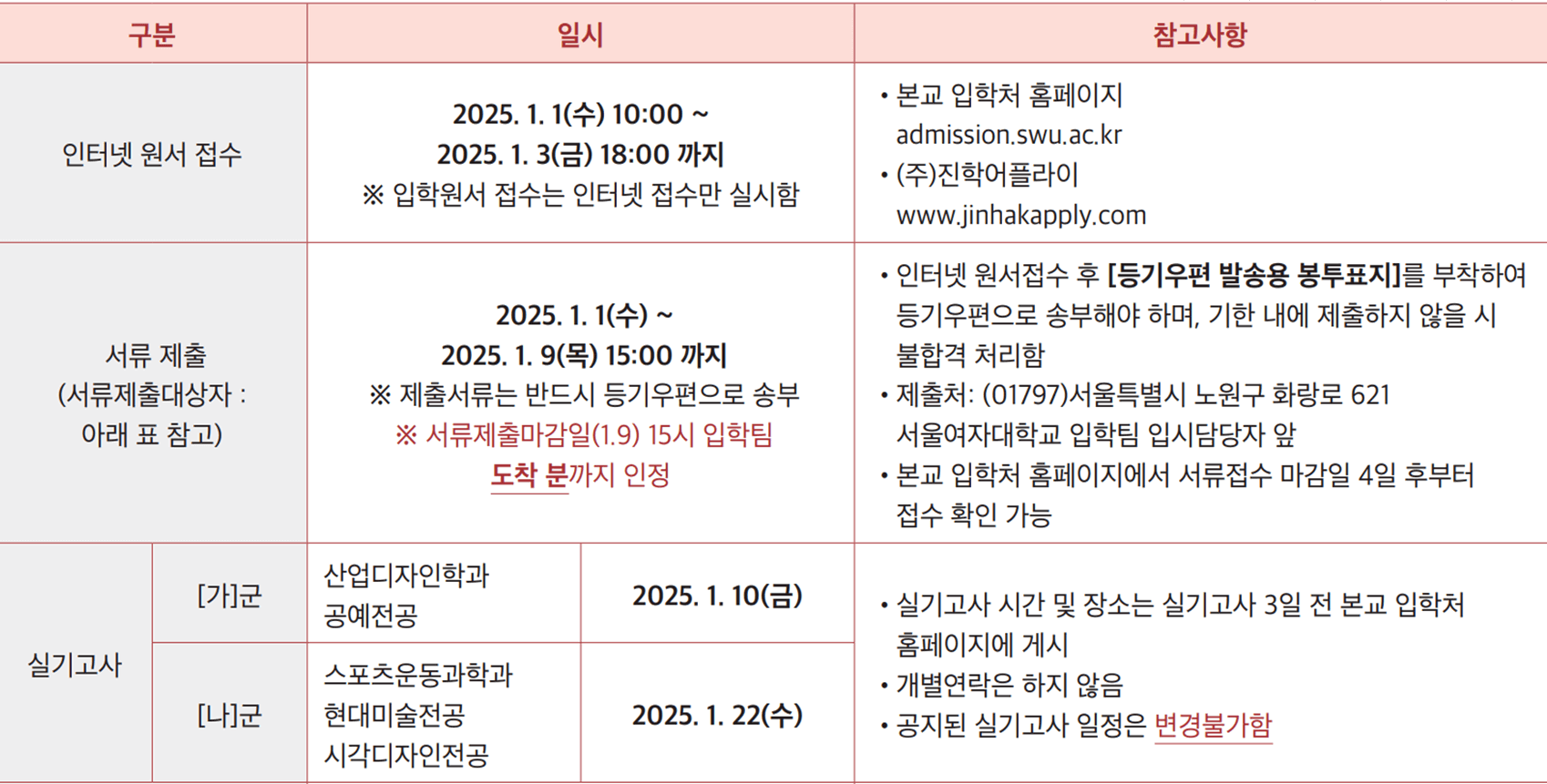 · 제출 기한: 2024. 1. 1.(수) ~ 2025. 1. 9.(목) / ※ 서류제출마감일(1.9.) 15시 입학팀 도착 분까지 인정