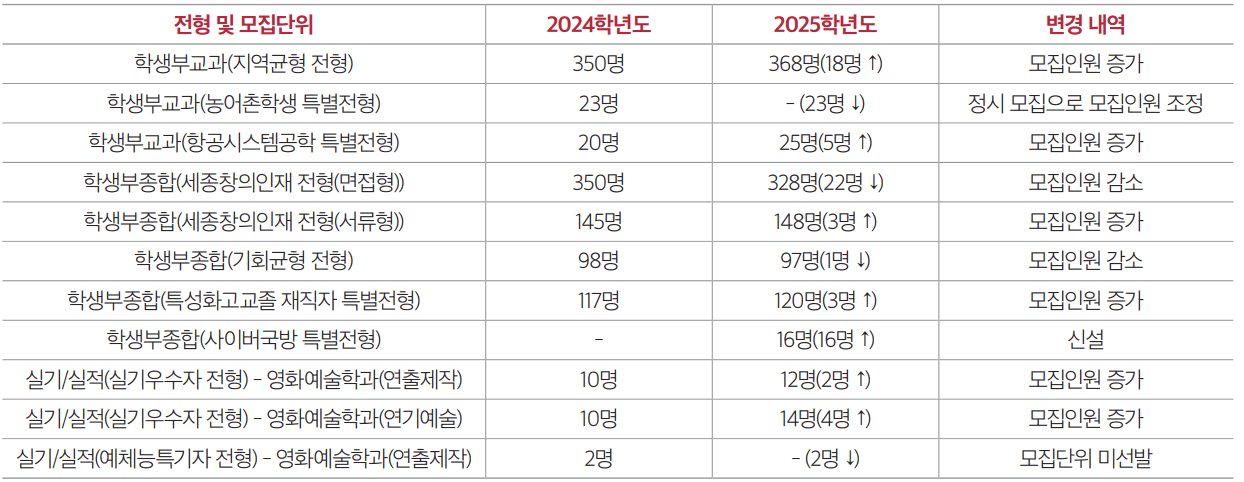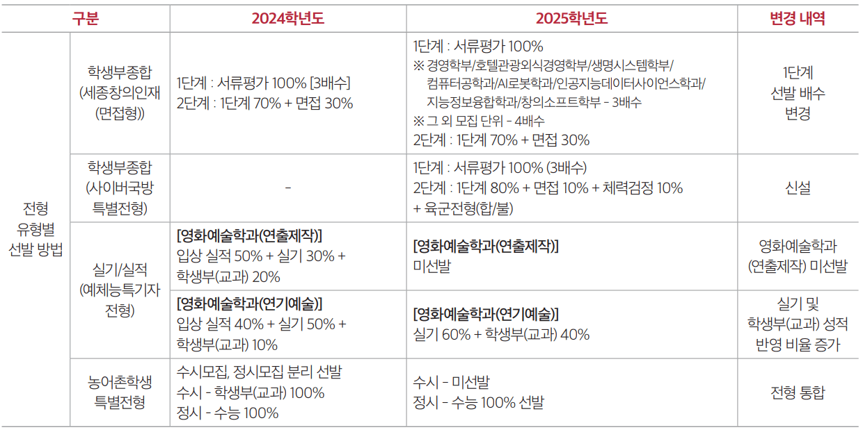 2025학년도 세종대 수시모집요강에 대해서 안내해 드리도록 하겠습니다. 주요 내용으로는 숫자로 보는 세종대학교, 창의 융합 교육 시스템, 장학·지원 프로그램, 학과 안내, 전형요약 및 주요 사항(변경 사항), 모집단위(학과)·전공(입학 정원), 원서접수, 전형 일정 및 합격자 발표 안내 [원서접수 및 전형 일정, 원서접수방법], 세부 전형별 안내 [학생부교과(지역균형전형, 항공시스템공학 특별전형), 학생부종합(세종창의인재 전형[면접형], 세종창의인재 전형[서류형], 기회균형 전형, 사회기여 및 배려자 전형, 서해5도학생 특별전형, 사이버국방 특별전형, 국방시스템공학 특별전형), 학생부종합전형 서류평가 안내, 학생부종합전형 면접평가 안내), 논술 [논술우수자전형], 실기/실적 [실기우수자 전형, 예체능특기자 전형], 학교생활기록부(교과) 반영 방법, 지원자 유의 사항, 등록 포기 및 환불 안내, 전형료, 학사안내(장학금, 기숙사, 학사, 국제교류, 취업 프로그램, 캠퍼스 안내) 등이 수록되어 있습니다.
