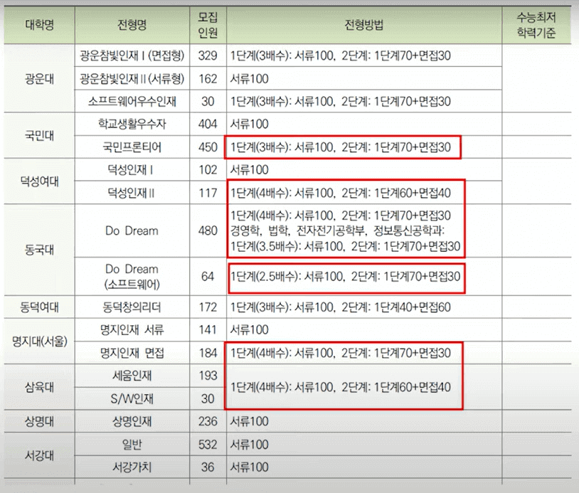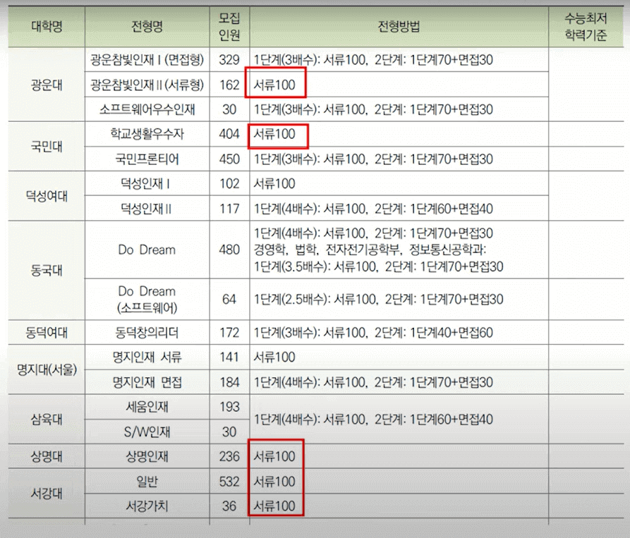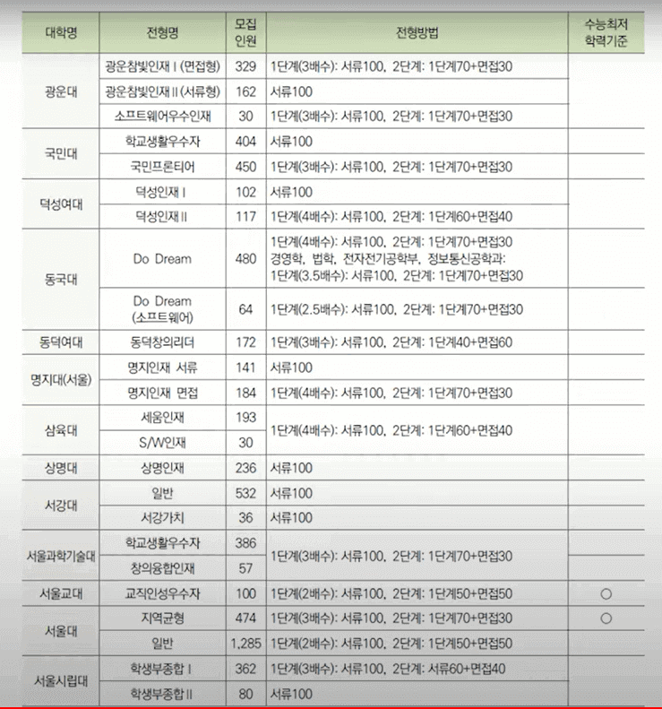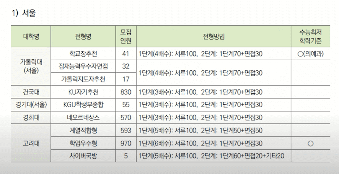 아래 표는 서울 소재 대학들의 학생부종합전형을 정리해 놓은 자료입니다. 각 지역 소재 대학들의 학종 전형방법을 모아 보고 싶으시다면 대입정보 119를 참고하시면 됩니다.