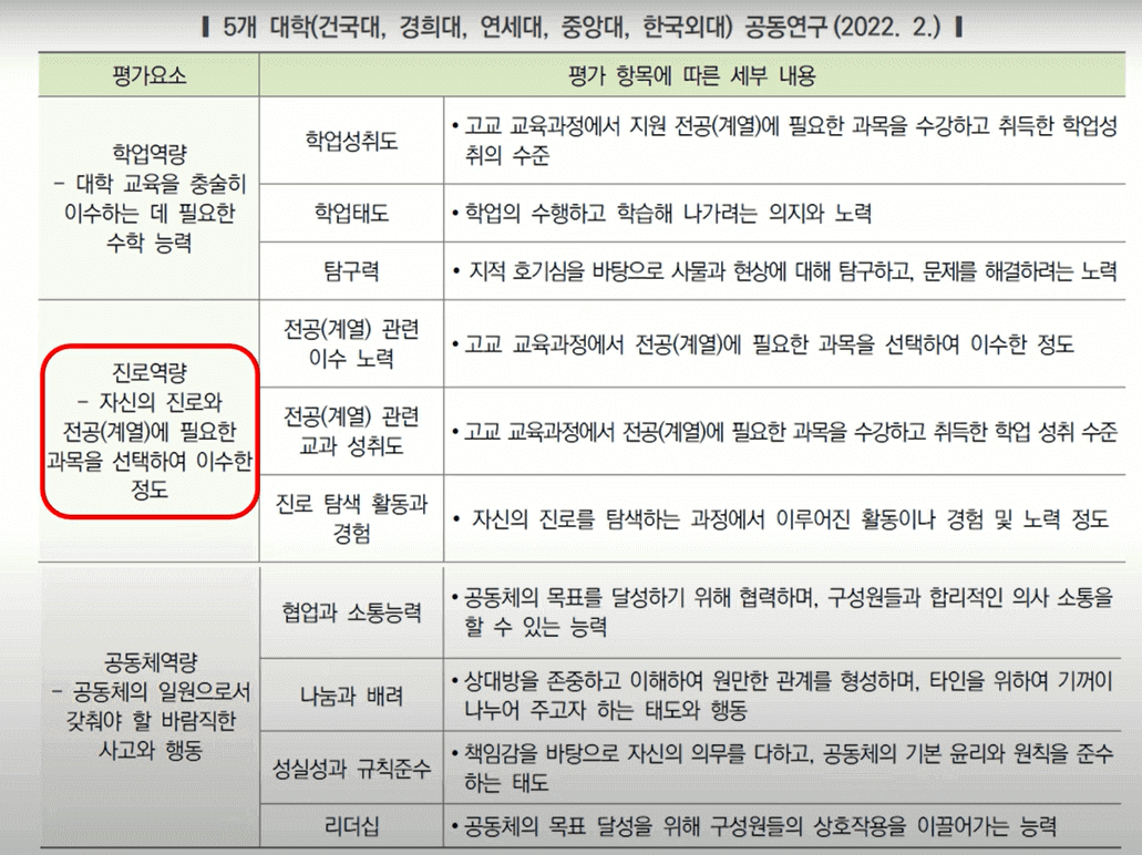 꼭 진로와 관련된, 관심있는 전공 계열과 관련된 동아리만 선택해야 하는지에 대한 의문이 드실 겁니다. 예를 들어, 학생이 배드민턴 동아리이라면 아래의 자료를 한번 보시면 됩니다. 학종에서는 크게 세 가지로 학생의 생기부를 평가하게 됩니다. 이 학생이 대학에 진학해서도 대학공부를 잘 따라갈 수 있을 만큼 학업역량을 갖추었는지, 자신의 진로와 전공계열에 필요한 공부들을 하고 또 잘 이수했는지 같은 진로 역량도 평가하지만 이것 말고도 공동체의 역량이라는 걸 평가하기 때문에 배드민턴부, 밴드부처럼 진로와 관련이 없는 동아리에서 활동하더라도 그 안에서 협력과 소통 나눔과 배려, 리더십과 같은 공동체 역량을 드러낸다면 충분히 의미 있는 동아리 활동기록이 될 수 있습니다.