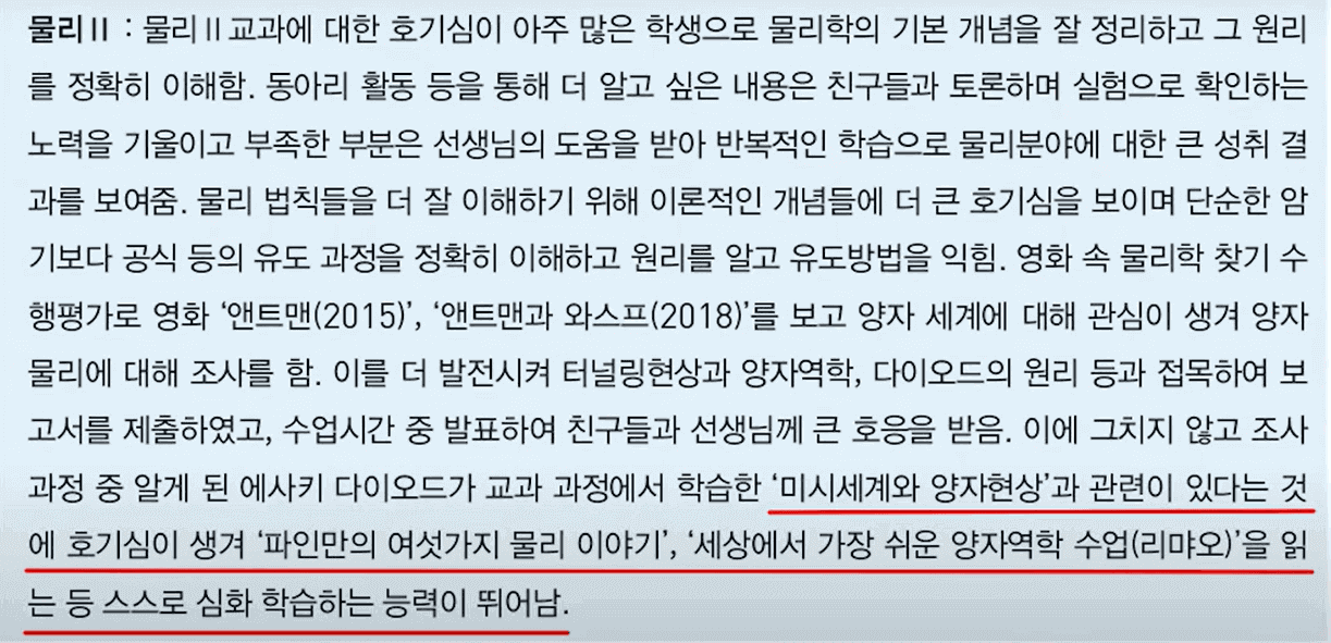 물리 2 교과세특의 예시를 보면, 마지막 부분에 빨간색으로 밑줄 친 것처럼 여전히 학생이 어떤 책을 읽었고, 어떤 점을 느꼈고 그래서 무엇을 배우고 성장했는지를 교과세특이나 동아리 활동과 같은 다른 부분에 기록할 수 있기 때문에 독서 자체가 대입에 미반영되는 것으로 바뀐 게 아니라 독서활동을 기재하는 방식만 바뀐 것으로 이해하시면 됩니다.