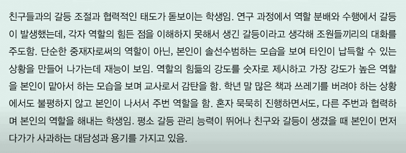 위 행특 예시처럼 주로 담임선생님의 시선으로 본 학생에 대한 기록이 담겨있는 부분이 바로 행특입니다. 교사추천서가 없어지면서 이 행특의 내용이 교사추천서를 대신할 유일한 부분이 됐기 때문에 이 행특 내용 역시 학종에서 굉장히 중요하다고 생각하시면 됩니다.