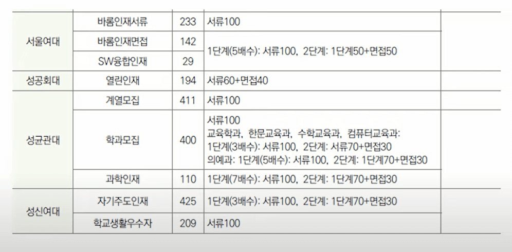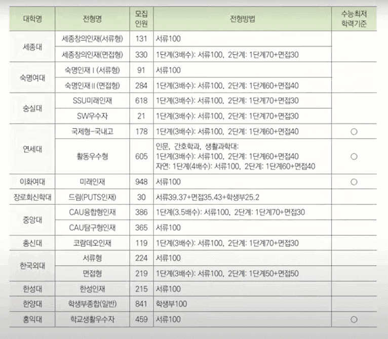 | 학생부 종합전형 | 교과성적(내신성적) + 비교과(수업태도, 동아리활동 등) √ 수업시간에 수업태도는 어땠는지? √ 동아리 활동은 뭘 했는지? √ 관심있는 진로, 그에 따른 어떤 활동을 했는지? √ 더 성장할 만한 자매력을 가진 학생인지? |
