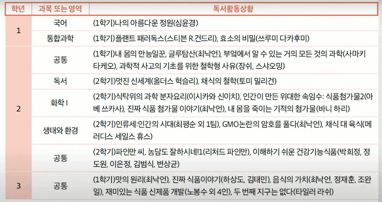 예전에는 이런 식으로 학생이 학년별, 과목별로 어떤 책을 읽었는지를 생기부에 적었었고 이 부분을 대학에 제출했었는데 이제 이 부분만 반영을 안한다는 것입니다. 여전히 학생이 어떤 책을 읽었고 어떤 활동을 했는지는 교과 세특이나 창의적 체험활동 기록에 쓸 수 있습니다.