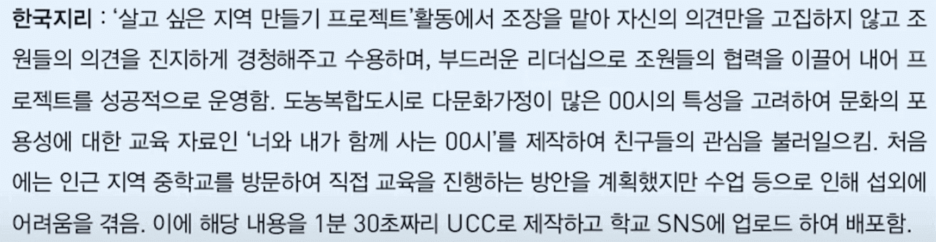 한양대 학종 가이드에 나왔던 한국지리 교과세특 예시입니다. 바로 이런 부분을 통해서 대학에서는 학생의 학업태도가 어땠는지, 배움의 동기는 무엇이었고 어떤 과정을 거쳐서 결과를 만들어냈는지 등 관심있는 전공, 계열과 관련된 심화활동들을 얼마나 했는지 등을 확인해서 학생을 평가하게 됩니다. 1학년 1학기 때부터 3학년 1학기 때까지 학생이 수강했던 모든 과목의 선생님들이 학생에 대해서 최대 500자씩 써주시게 되어 있기 때문에 수시 학종에서 제출하는 생활기록부 중에서는 가장 비중이 큰 부분이고 가장 중요한 부분이라고 할 수 있습니다. 교과세특만큼 중요한 부분이 바로 행동 특성 및 종합 의견 즉 행특입니다.