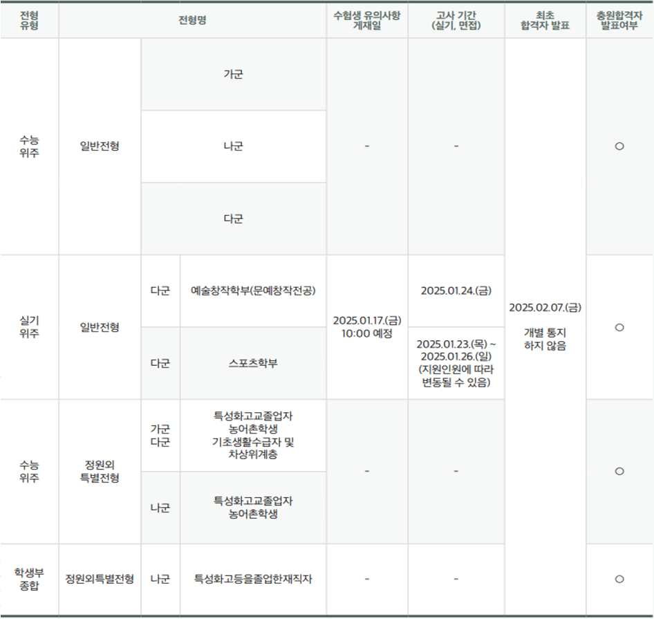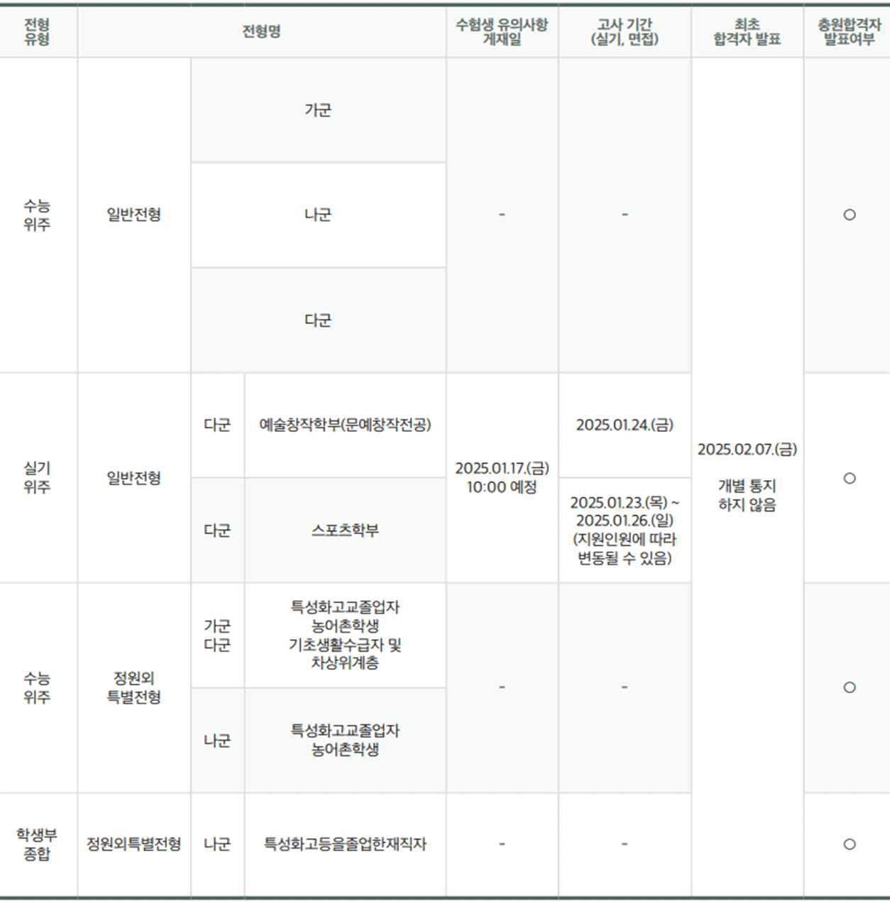 | 발표방법 | 입학처 홈페이지 공지 | 개별 전화 충원+익일(오전10시) 홈페이지 공지 |