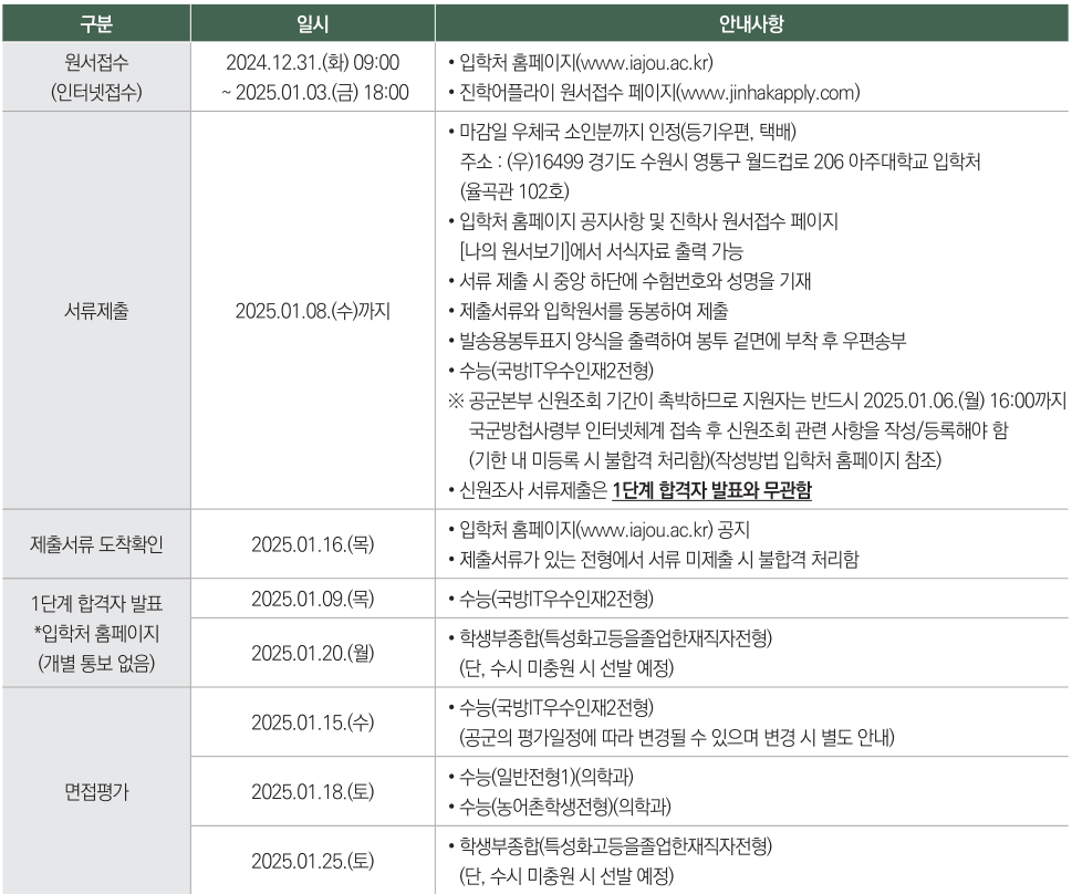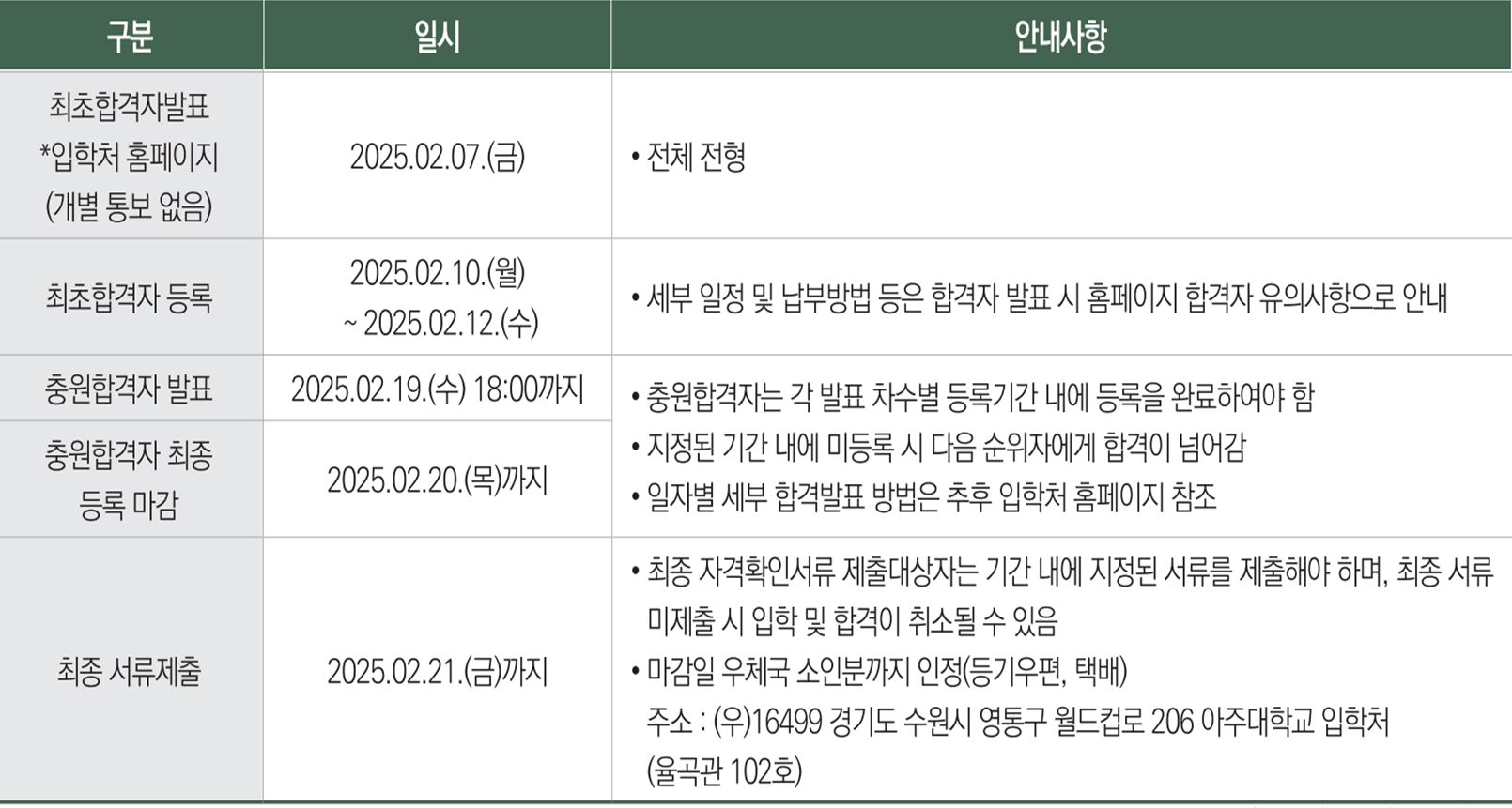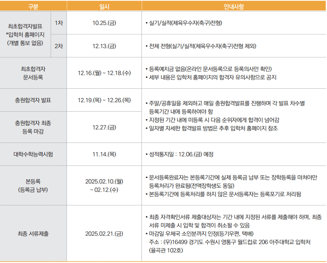 2025학년도 아주대 수시모집 합격자 발표일 및 충원(추가) 합격자 발표일 등을 안내해 드리도록 하겠습니다. 아래 일정을 참고하셔서 입학 등록에 차질이 없으시기 바랍니다.