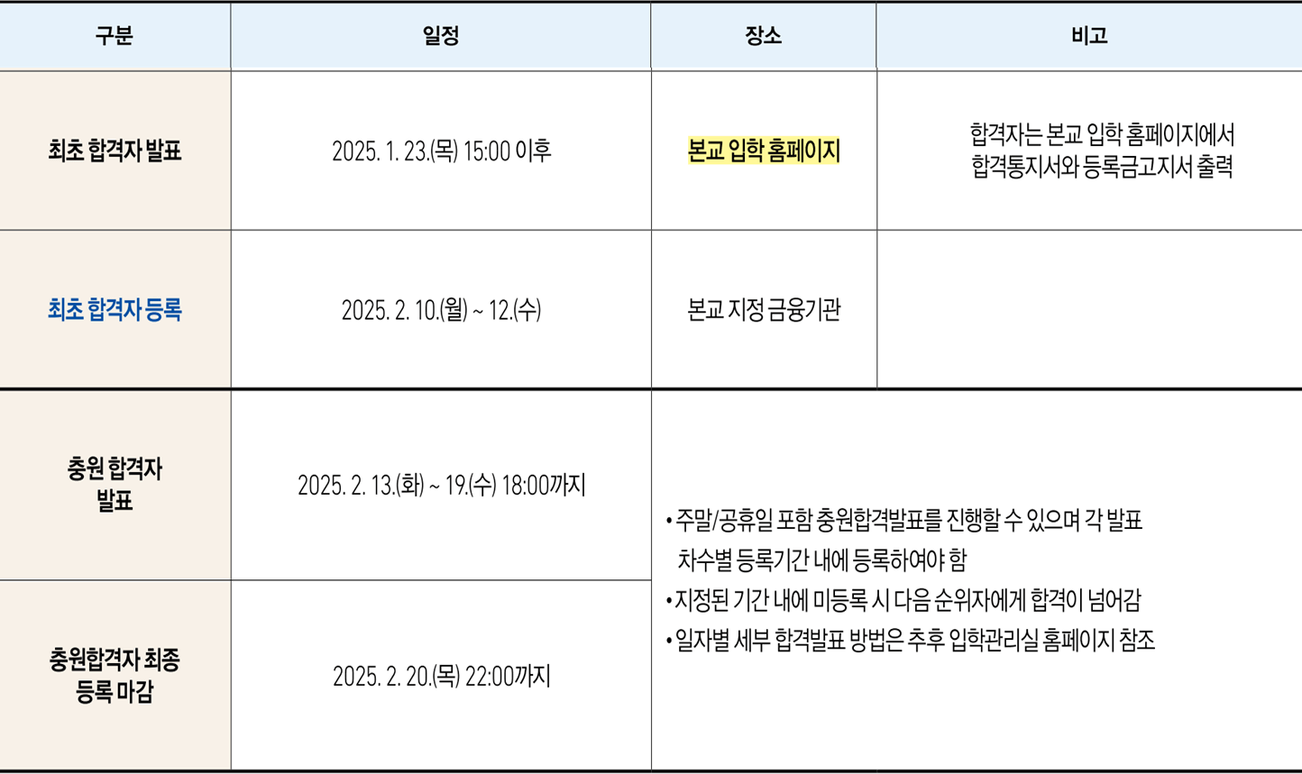 | 입학원서 접수 | 2024. 12. 31.(화) 10:00 ~ 2025. 1. 3.(금) 18:00 |