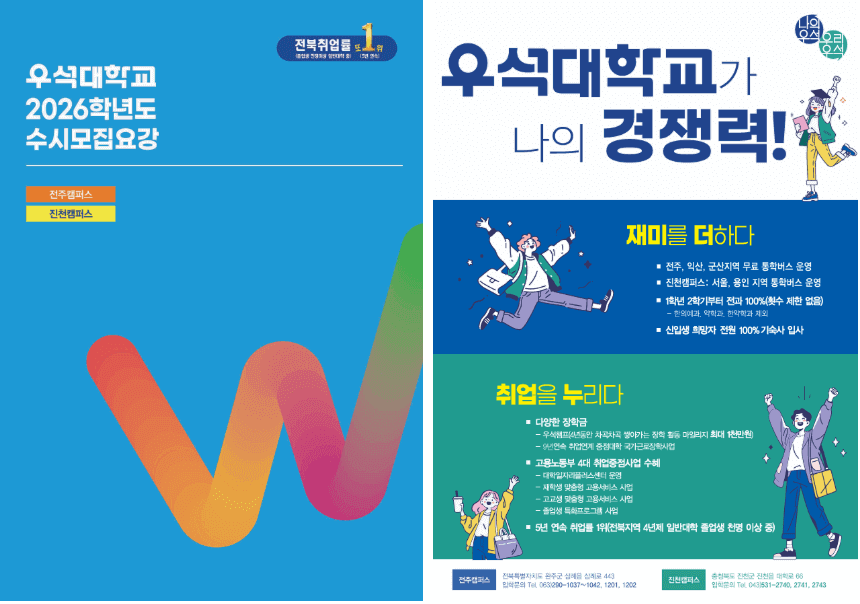 우석대학교는 지역 인재를 적극 발굴하고, 다양한 학생들의 역량을 종합적으로 평가하는 수시모집 전형을 운영합니다. 특히 학생부종합(지역인재전형)과 학생부종합(면접중심전형)은 교과 성적 외에도 인성, 전공적합성, 발전 가능성을 중점적으로 반영하여 지역 우수 인재 및 준비된 인재에게 폭넓은 기회를 제공하고 있습니다. 아울러 아래에 있는 2025학년도 수시모집 합격자 내신등급을 참고하셔서 지원 시 활용하시기 바랍니다.