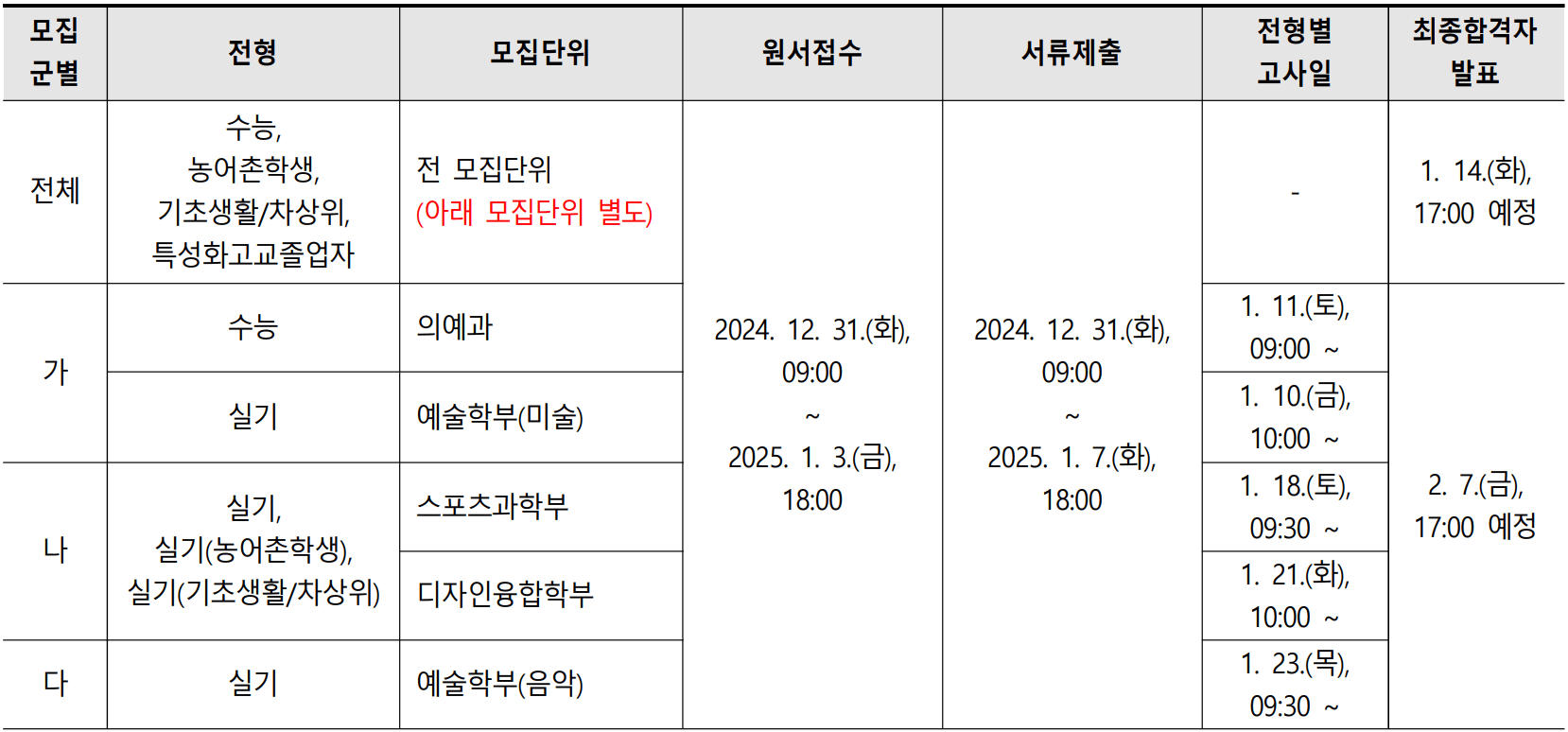- 실기/실적 : 예체능(디자인융합학부), 예체능(스포츠과학부), 예체능(예술학부), 특기자, 경기실적우수자