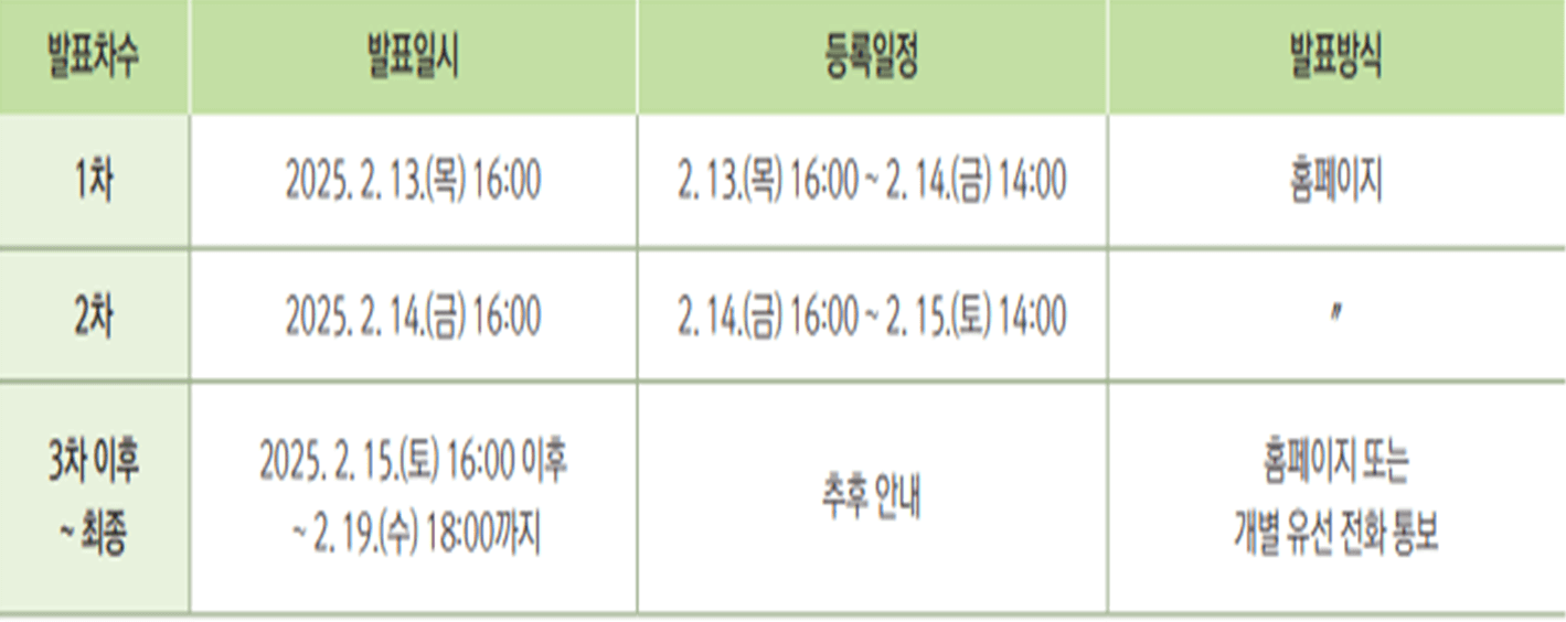 - 3차 이후 ~ 최종 : 2025. 2. 15.(토) 16:00 이후 ~ 2. 19.(수) 18:00까지