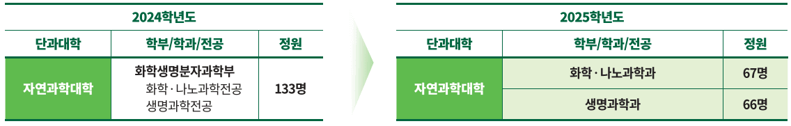 ▶ 자연과학대학 학부 정원 및 편제 조정: 화학생명분자과학부 소속 전공을 학과로 개편