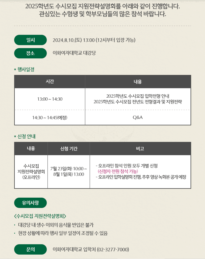 2024년 5월 18일에 치러진 2025학년도 이화 입학콘서트, 학생·학부모 입학설명회가 이화여대 대강당에서 열렸습니다. 참여하지 못한 수험생분들을 위해 약 1시간 40여분 정도 분량의 입학설명회 동영상을 보시고 수시 지원에 참고가 되셨으면 합니다.