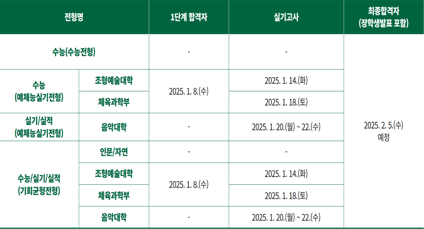 - 수능/실기/실적(기회균형전형) : 인문/자연, 조형예술학부, 체육과학부, 음악대학