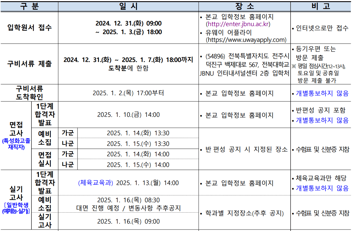 2025학년도 전북대 수시모집 합격자 발표일 및 충원(추가) 합격자 발표일 등을 안내해 드리도록 하겠습니다. 아래 일정을 참고하셔서 입학 등록에 차질이 없으시기 바랍니다.