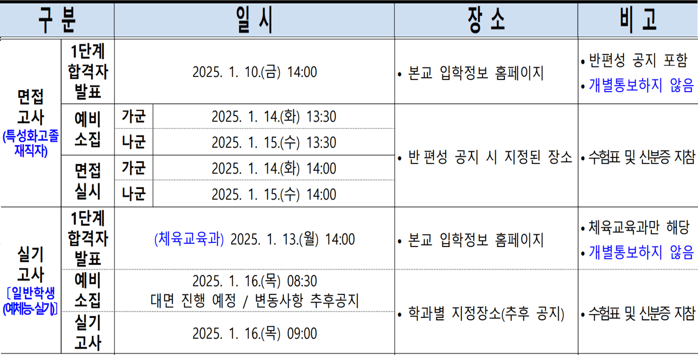 - 면접고사(특성화고졸재직자) : 2025. 1. 10.(금) 14:00