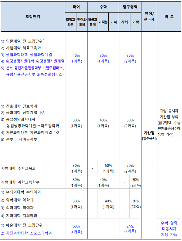 2. 모집단위(학과)별 수능성적 반영영역 변경