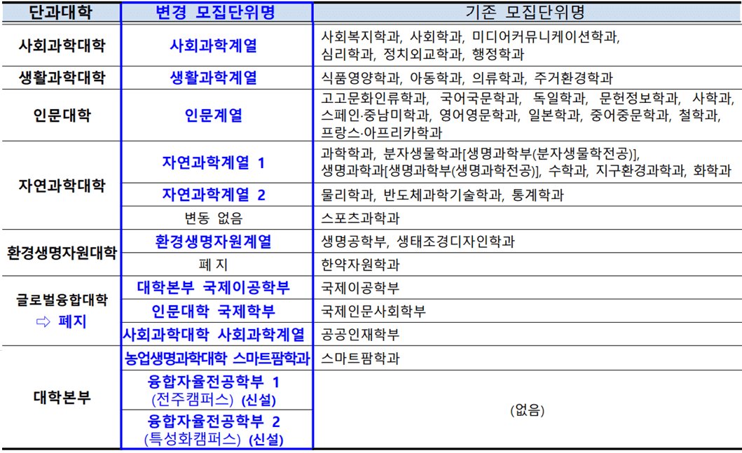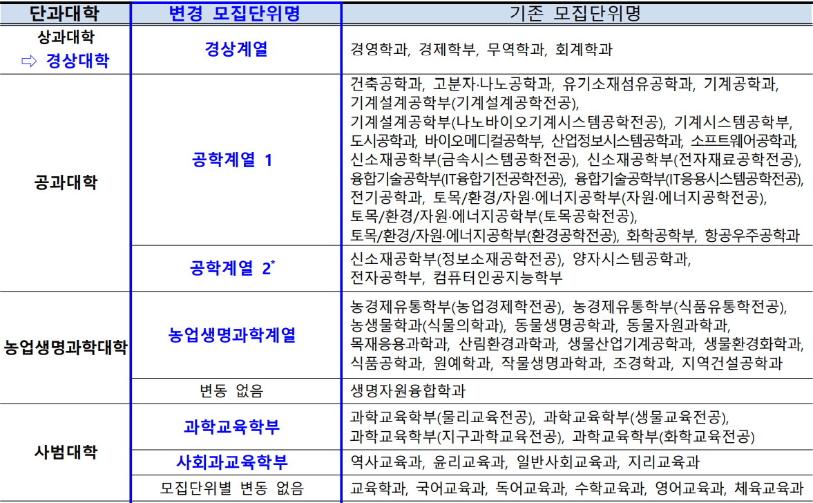 1. 모집단위(학과) 광역화에 따른 모집단위 변경