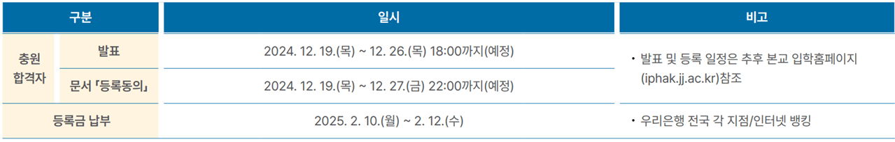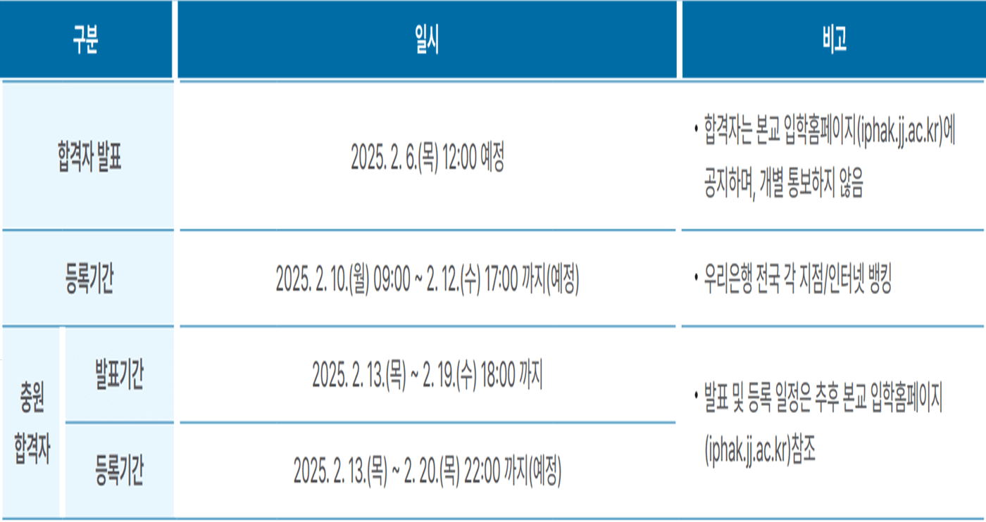 2025학년도 전주대 수시모집 합격자 발표일 및 충원(추가) 합격자 발표일 등을 안내해 드리도록 하겠습니다. 아래 일정을 참고하셔서 입학 등록에 차질이 없으시기 바랍니다.