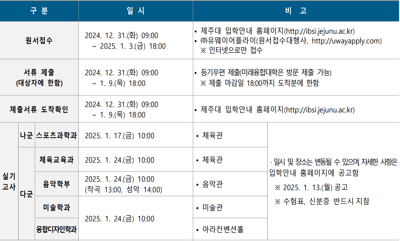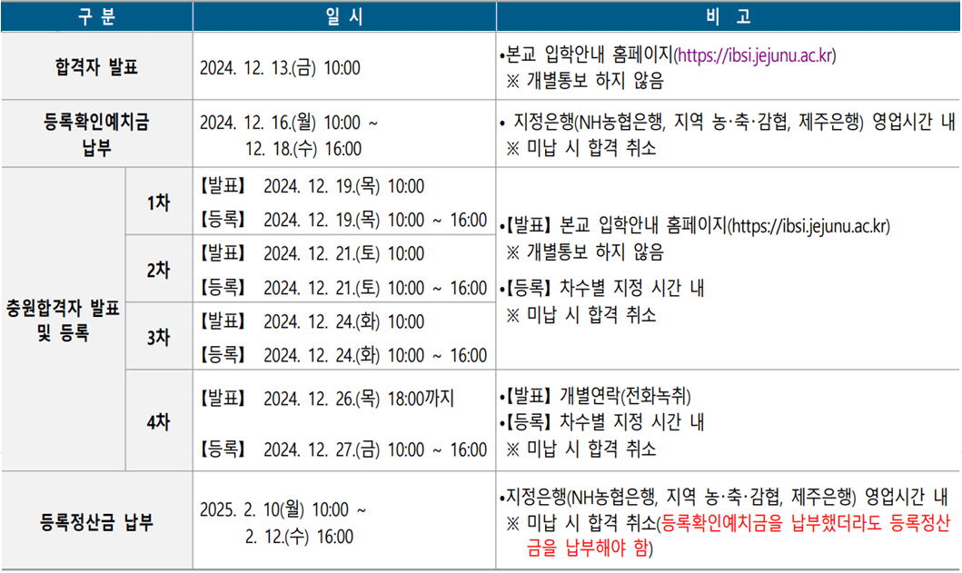 2025학년도 제주대 수시모집 합격자 발표일 및 충원(추가) 합격자 발표일 등을 안내해 드리도록 하겠습니다. 아래 일정을 참고하셔서 입학 등록에 차질이 없으시기 바랍니다.